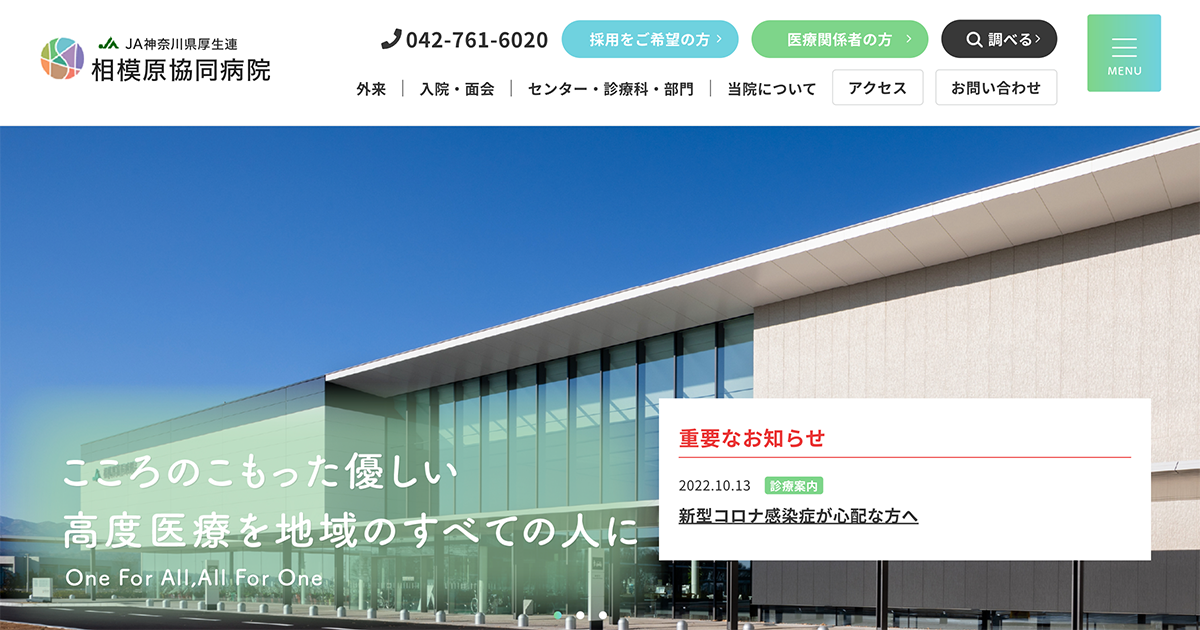 神奈川県相模原市にある相模原協同病院です。創立79年を迎える当院は、令和3年に移転しました。24時間対応の脳卒中センターや2次救急医療など、地域に寄り添う医療を提供しています。当院について詳しくはこちらをご覧ください。